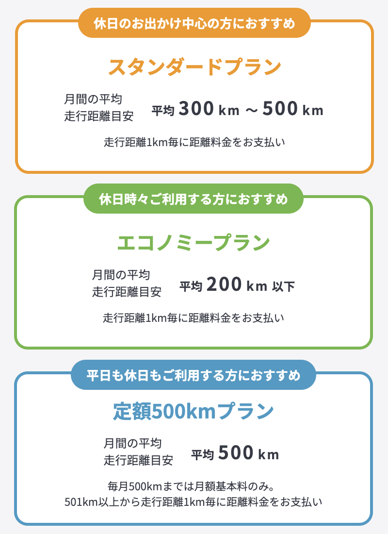 料金プランは《エコノミープラン》《スタンダードプラン》《定額500kmプラン》の3種類が用意されています。それぞれ、月間走行距離を目安にプランが選べるようになっています。